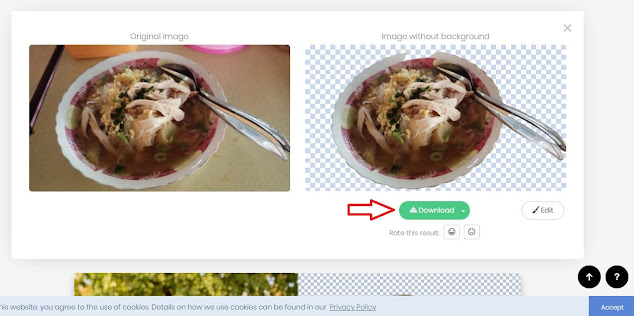 Jika hasilnya sesuai, yaitu bagian yang harus dihilangkan sudah hilang dan bagian yang harus dipertahankan masih dipertahankan (Remove Background fotonya sempurna) langsung klik Download untuk menyimpannya di komputer / HP kita ya.